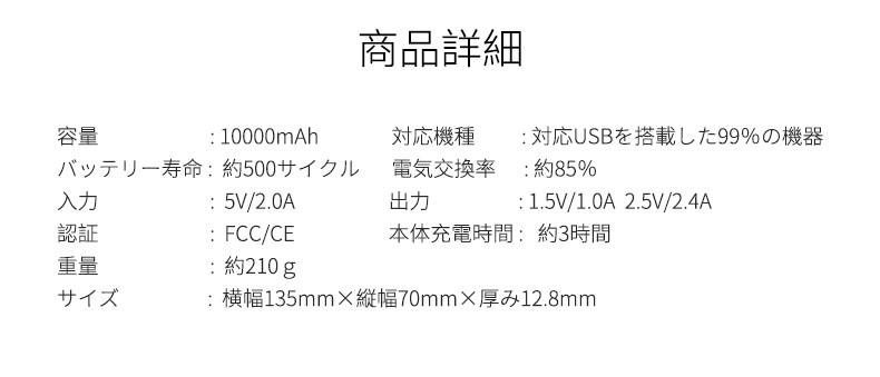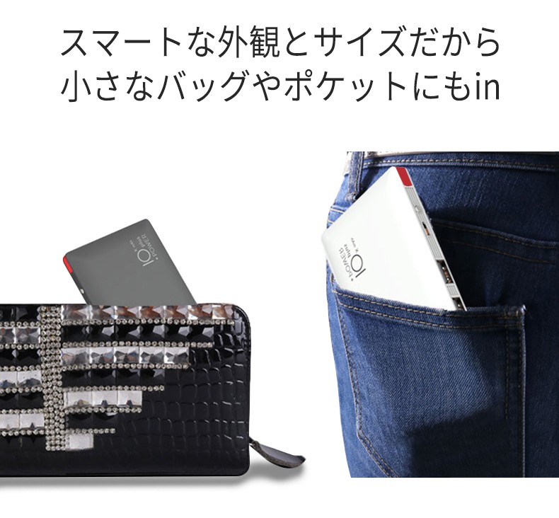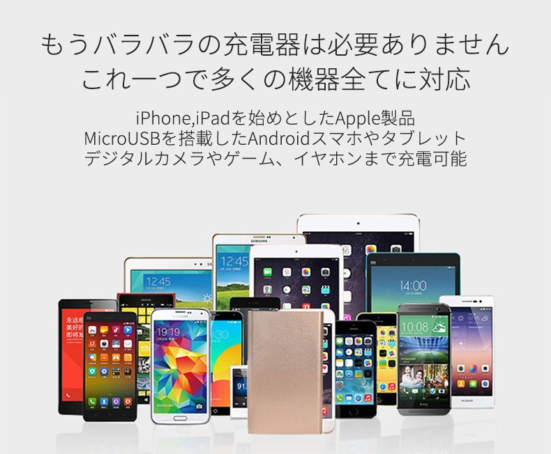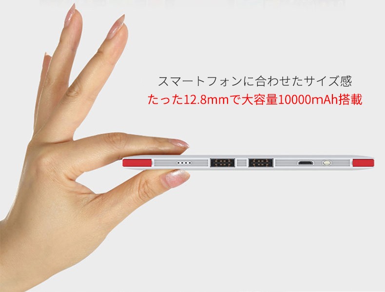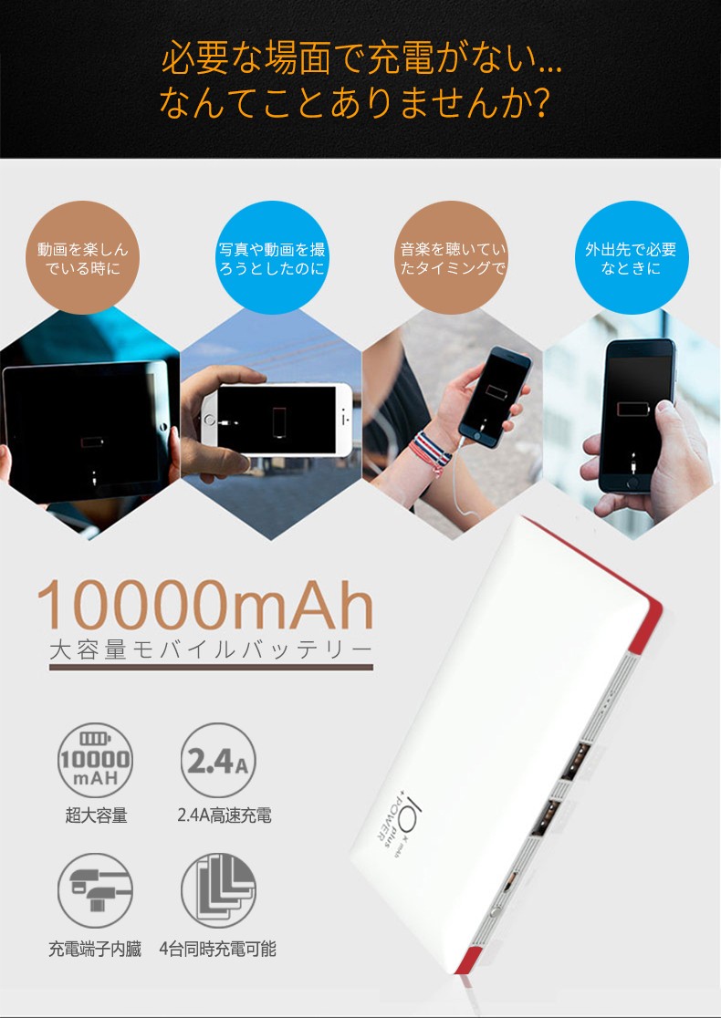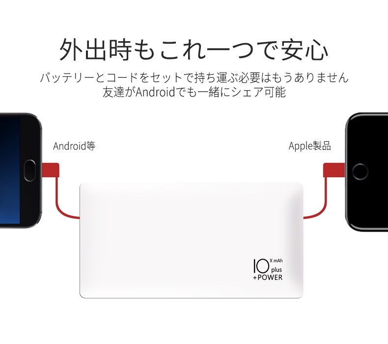 薄型超軽量でケーブル内蔵の大容量モバイルバッテリー登場!カラー・ゴールド・ローズゴールド・ブラック・グレー・ホワイト【 10000mAh超大容量モバイルバッテリー 】10000mAhの大容量ながら薄さは12.8mm、重量たったの210g使う場所を選ばないシンプルコンパクトデザイン4台同時出力にも対応でこれ一台で身の回りのありとあらゆる機器を同時に充電!しかも高速充電にも対応【 各種充電ケーブル内蔵 】オシャレな見た目に隠れた便利機能!iPhone充電端子、MicroUSB-B端子それぞれを本体に内蔵しケーブルの煩わしさから開放!※USB Type-C対応機種の充電には、別売りの変換アダプターが必要です。もうケーブルを別に持ち歩く必要はありません。これさえあればSoftbank,docomo,auなどの国内キャリアを含めたXperia,Huawei,ASUS Zen Fone,Galaxy,iPod...etc数多くの機種に充電する事が可能になります。
