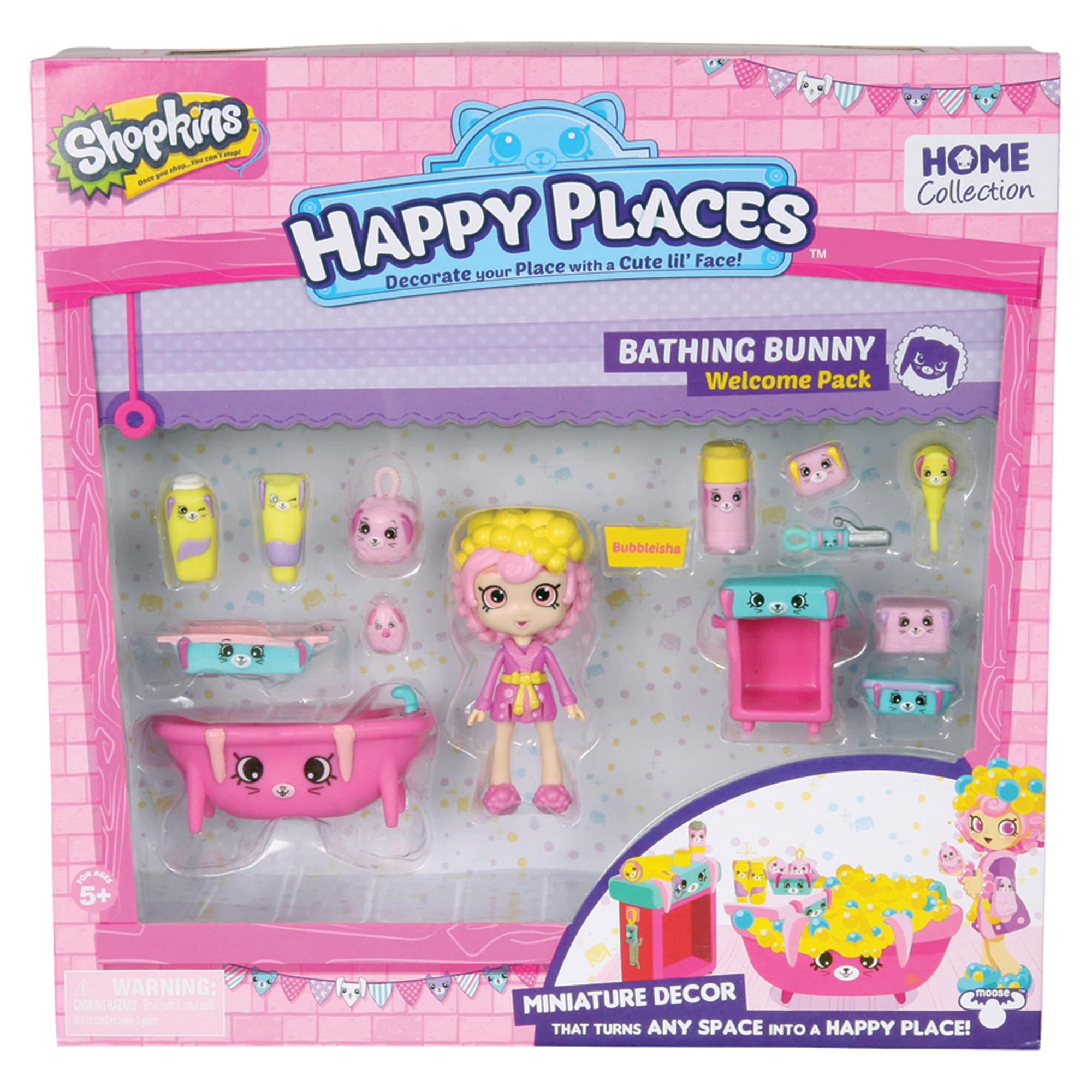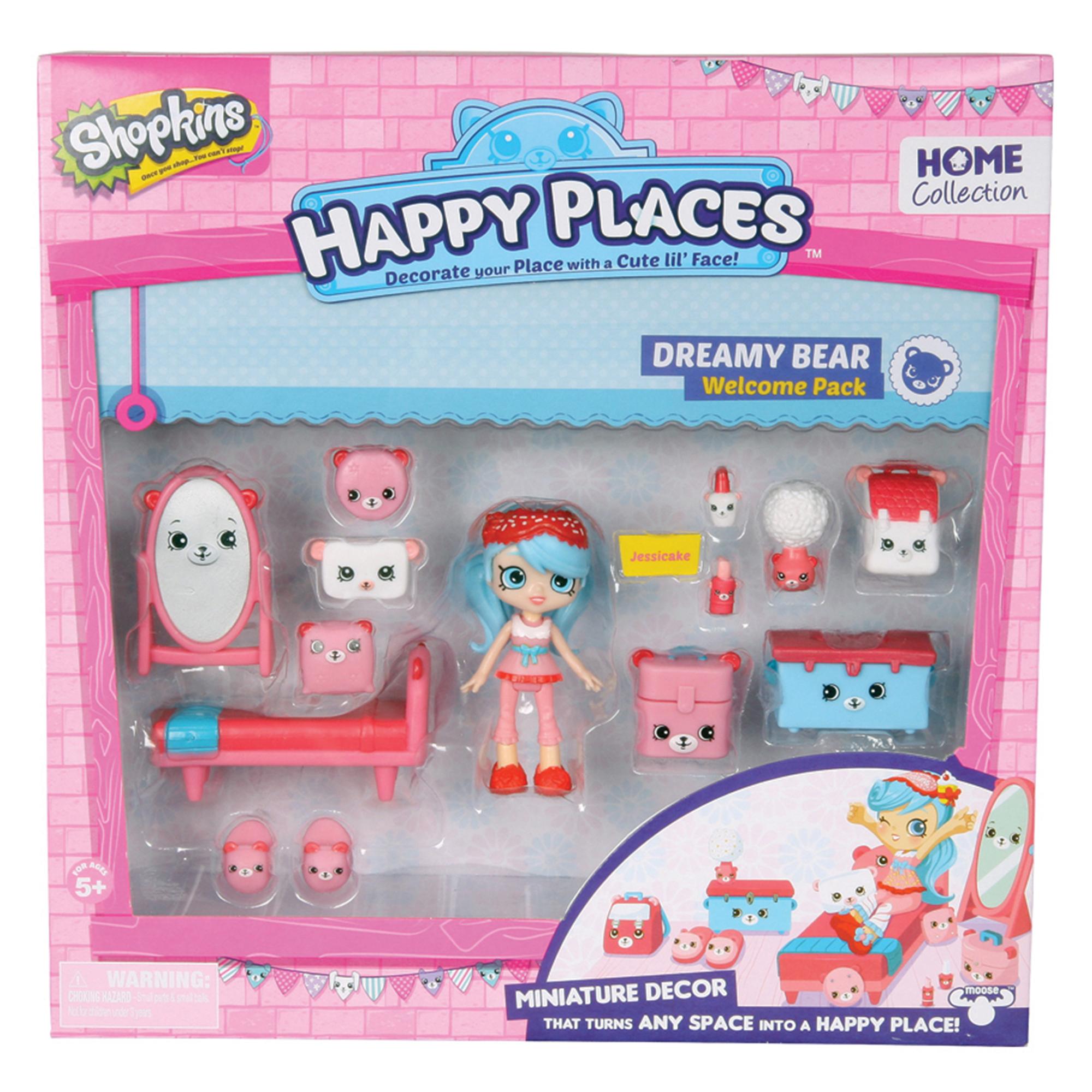 The Shopkins Happy Places In The Home Welcome Pack Assortment features the Bathing Bunny Bathroom, Kitty Kitchen u0026amp; Dreamy Bear Bedroom (one supplied). Each set contains 1 Lil Shoppie, 1 Large Petkin, 2 Medium Petkins, 6 Small Petkins, 4 Mini Petkins, 2 Tiles u0026amp; 1 Catalogue.