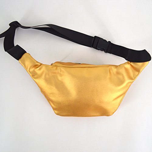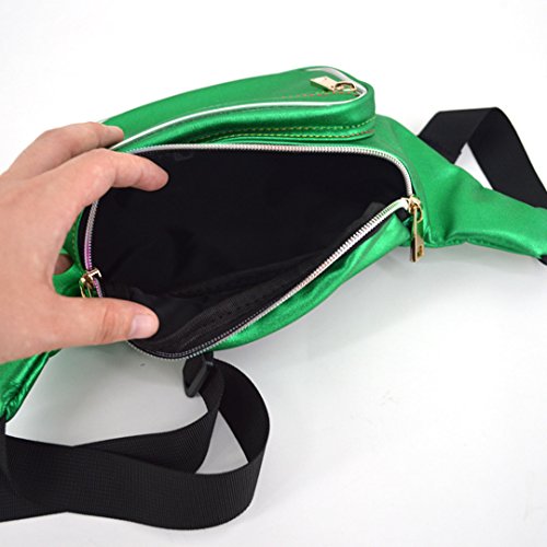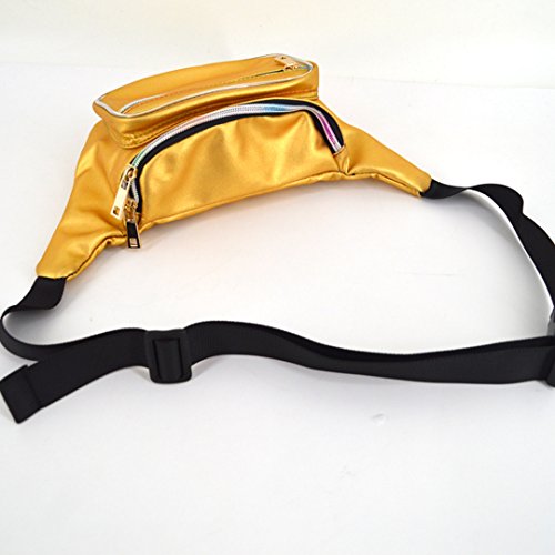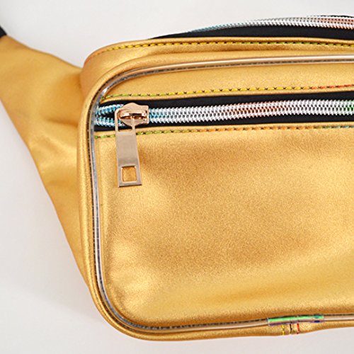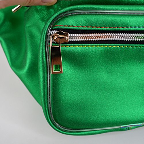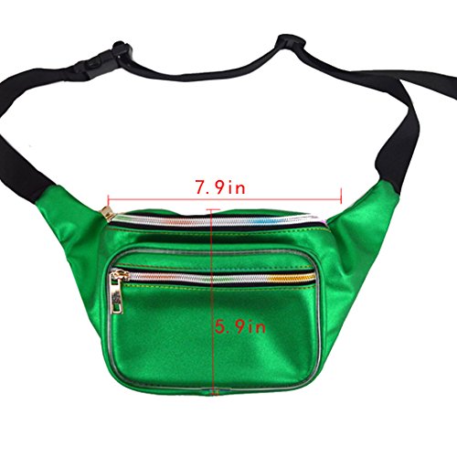 -. Feature : Made of high-quality frosted material; glossy to look, easy to clean and durable to use. / Product Size: 7.9 * 5.9in. Adjustable strap fits different body waist and the adjustable waist belt can also used for shoulder strap. / Holographic fanny pack could reflect lights, change colors, shining and bling in the sunshine, looks fashionable, stylish and full of personality. / One main zipper compartment with two zipper pullers and another little zipper pocket on the top.