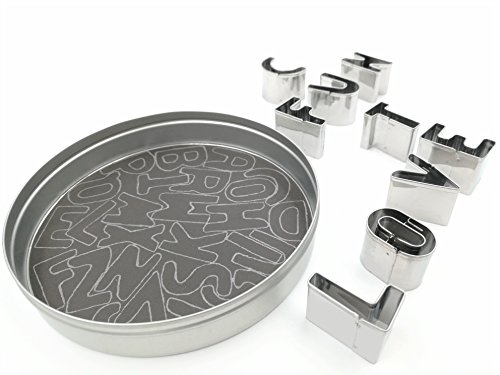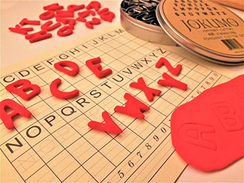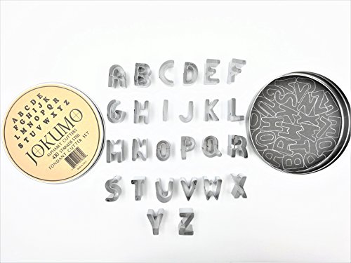 JOKUMO Mini Alphabet Letters A-Z fondant cutters 26 pieces high grade 430 Stainless Steel with storage tin and shape identify template paper. Perfect for cookie, fondant vegetable and fruit.