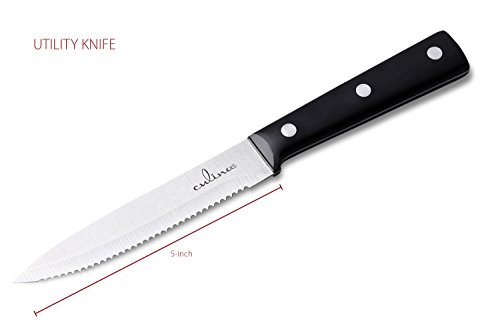 - 5'' Serrated Knife : sturdy yet flexible and versatile, delivers swift slicing thin or raw texture. Effortlessly complete any task from halving small hard rolls to quickly ripping up raw lettuce or spinach.