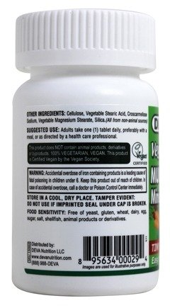 Deva Vegan Tiny Tablets Multivitamin provides varying amounts of vitamins and minerals to make the product useful. Formulated especially for vegans and vegetarians, the product provides 100% of the recommended daily amount of the antioxidant vitamins C and E, as well as vitamin D and each of the B-complex vitamins. It also provides a significant amount of vitamin A and some of the essential minerals.Getting an adequate amount of vitamins and minerals each day is important for several reasons. Vitamins are involved in many processes required for the body to function properly, including blood clotting, immune system function and regulating the metabolism. Particularly important are the antioxidant nutrients, which include vitamins A, C and E and the mineral selenium. These nutrients protect cells from the damaging effects of oxidation, a process that occurs naturally in the body every day. Minerals, including calcium, magnesium, zinc and others, are involved in the development of bones and provide structure for cells.DEVA Vegan Multivitamin is 100% animal free, certified VEGAN by the Vegan Society, and guaranteed for purity, freshness and labeled potency.Feature