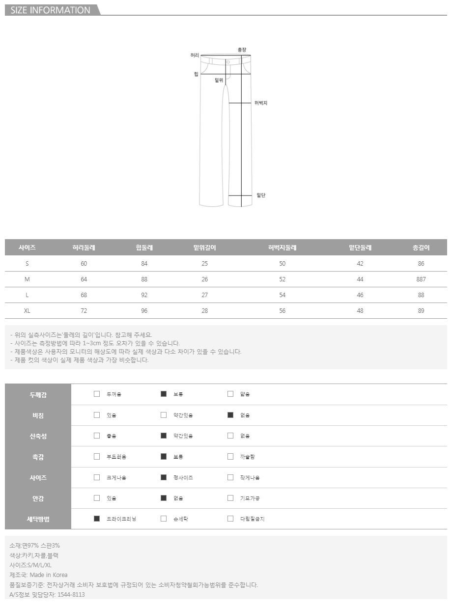 가장 부드럽고 편안하게 접할 수 있는 코튼 소재로 민감한 피부에 닿아도 부담 없이 쾌적하며 스판이 가미되어 마치 찰떡 같은 놀라운 탄성까지 UP~ 또한, 여유로운 느낌의 깔끔한 일자 핏으로 스키니 핏이나 부츠컷 핏보다도 훨씬 부담스럽지 않게! 그리고 자유롭게! 착용하실 수 있어 만족도는 200%! 따로 오픈 클로징 라인이 없어 간편한 탈착용부터 들뜸 없이 라인을 잡아주는 허리 밴딩으로 장시간 착용에도 전혀 무리가 없으실거에요:) 차분한 세가지의 컬러 라인업과 함께 워낙 스탠다드한 디자인이기 때문에 어떻게 매칭하느냐에 따라 색다른 스타일링이 기대되니 놓치지 마세요-♡