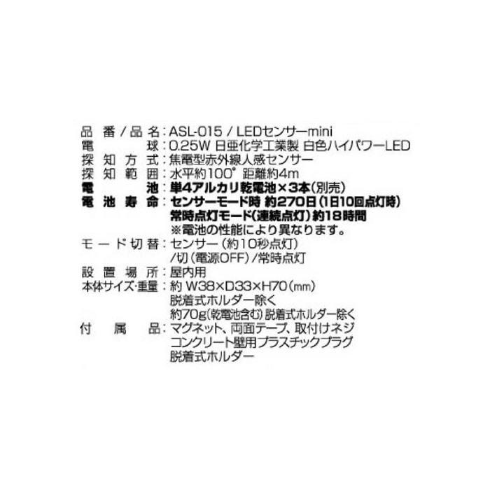 전지 수명:센서 모드 시/약270일(날)(1일(날)10회 점등 시)고, 항시 점등 모드(연속 점등)/약18시간 ※전지 성능에 의해 다르다