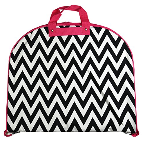 -. Brand : Ever Moda -. ClothingSize : X-Large -. Color : Chevron Black w/Fuschia Trim -. Department : womens -. EAN : 0802745670681 -. Feature : 600 Denier Polyester Nylon lining / Metal hook for hanging multiple pieces of clothing / 2 interior zippered pockets for shoes, accessories etc. / Clothes stay neat and wrinkle free / Bag will bifold, with top carry handle to perform as a carry on -. ProductGroup : Apparel -. ProductTypeName : LAGE -. Size : X-Large -. Title : Ever Moda Designer Print Collection 40-inch Hanging Garment Bag -. UPC : 802745670681
