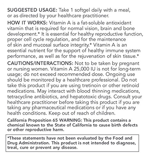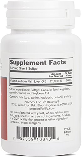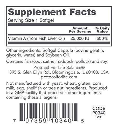 HOW IT WORKS: Vitamin A is a fat-soluble antioxidant vitamin that is required for normal vision, brain and bone development.* It is essential for healthy reproductive function, proper cell cycle regulation, and for the maintenance of skin and mucosal surface integrity.* Vitamin A is an essential nutrient for the support of healthy immune system performance, as well as for the rejuvenation of skin tissue.* Contains fish (cod, saithe, haddock, pollock) and soy.Protocol For Life Balance® is an A-rated GMP manufacturer of pharmaceutical grade dietary supplements created for healthcare practitioners. Our product line is comprised of effective, science-based formulations intended to address common nutrient deficiencies and support healthy physiological function. These formulations are based on the latest advances in nutritional science and incorporate trademarked ingredients of the highest quality. Our serving sizes are based on doses used in clinical trials and other published data, and the ingredients used in our products have been tested for efficacy in clinical trials and laboratory studies.