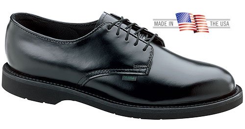 Product Description Men's Thorogood Classic Leather Oxfords are a Thorogood top-seller! Plus these Oxfords are made in the U.S.A.! These Classic Leather Oxfords are supportive, durable and comfortable... ideal work and duty Shoes for long days: Smooth high shine leather uppers; Slip-resisting Vibram EVA outsole; Rubber midsole; Removable Poly-Pillow Footpacer insole; Fiberglass shank for support; Comfort weave lining for durability; Repairable Goodyear Welt construction; U.S. Postal Certified for comfort... tough enough for all-day mail delivering; Each approx. 17 ozs. State Width and Size. Order Today! Men's Thorogood Classic Leather Oxfords, Black