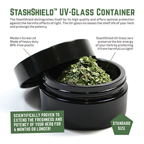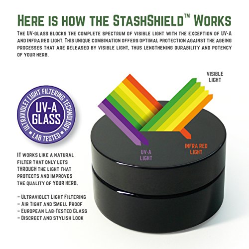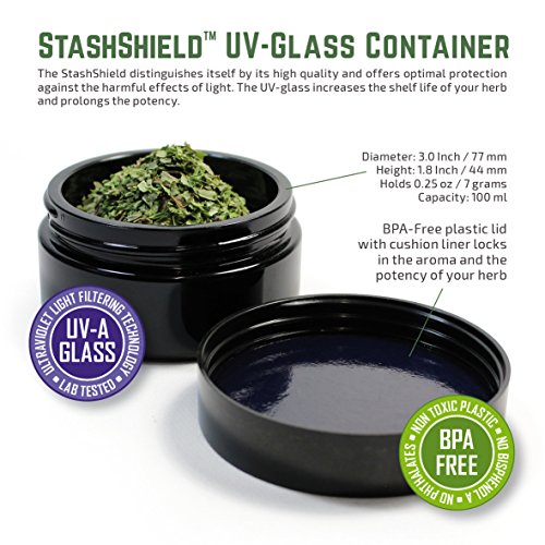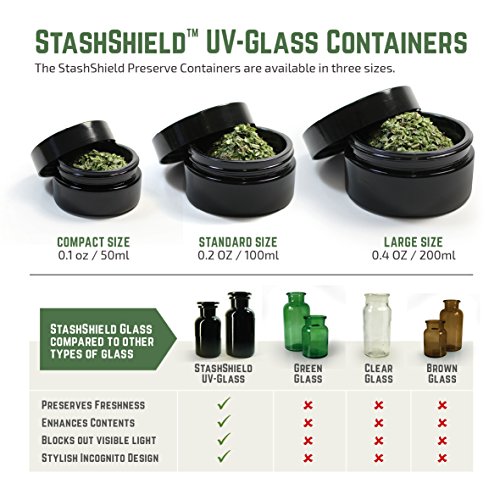 PRESERVATION & DISCREET STORAGE - StashShield UV Glass Containers store and preserve the contents, increasing the shelf life and prolonging the potency. The StashShield discreetly stores its contents, as it has no logos and the dark glass is nearly opaque.