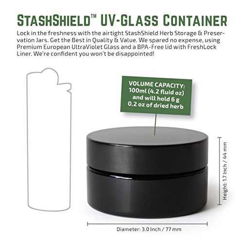 STASHSHIELD 100ML STORAGE JAR - The StashShield distinguishes itself by its high quality and offers optimal protection against the harmful effects of light. Volume Capacity: 100ml (3.4 fluid oz) and will hold a quarter ounce (1/4 oz) of dried herbs | Height: 1.8" | Diameter: 3.0" | Opening of Mouth: 2.4". Great size for travel or on the go! Fits easily into a backpack or purse.