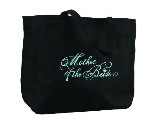 Studio : Sourced Wit Publisher : Sourced Wit Binding : Misc. Product Description Black tote bag embroidered with the words Mother of the Bride makes a great gift- a special memory of a special day. Aqua embroidery with silver diamond; bag is 12 by 6.5 by 14-inch and has convenient inner pockets. Made of easy care 100% Polyester. Invite HBH to your big day. 0
