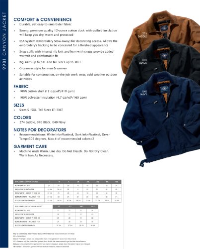 Studio : Charles River Apparel Men's Outerwear Publisher : Charles River Apparel Men's Outerwear Binding : Apparel Product Description Charles River Apparel's canyon jacket is made of premium quality 12-ounce 100 percent cotton duck fabric. Cotton twill and nylon lining, quilted with insulation. Available in larger sizes up to 5XL. Features open hem with snaps and snap cuffs with internal rib knit for warmth. Esa system (embroidery stow-away) for easy decorating access. When looking for quality outerwear, look to Charles River Apparel. 0