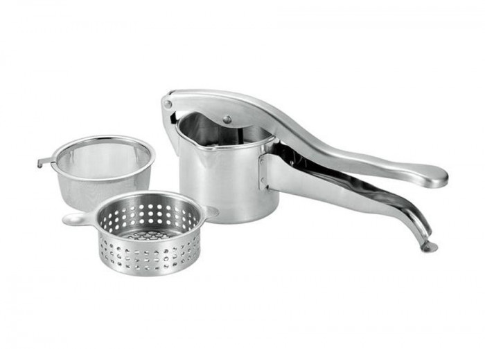 | 果物や野菜をそのまま入れて、ハンドルを押すだけで簡単に100%ジュースが作れる!ステンレス製のジューサーです。 |