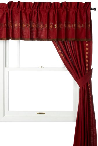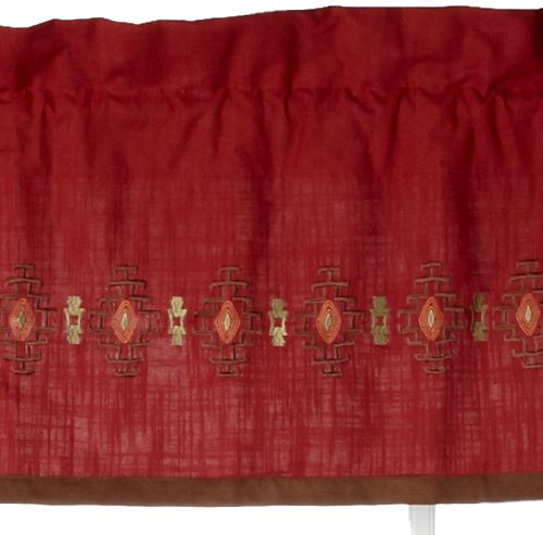 Embodying southwest sophistication chimayo's tailored valance measures 82-Inch by 16-Inch. Adobe red linen like fabric with an embracing aztec inspired embroidered border. A coffee brown suede band completes the hemline with an additional touch of richness and warmth.Feature