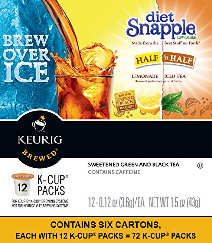 -. Binding : Grocery -. Brand : Snapple -. Feature : Ships in Amazon Certified Frustration-Free Packaging / Tasty tea and tangy lemonade blended together for a flavor combination that is sure to please. / Sweetened Green and Black Tea. Flavored with other natural flavor. Contains caffeine, Kosher (U). 10 Calories per Serving. / KEURIG QUALITY: If it doesn't have the Keurig logo, it's not Keurig quality. In order for your Keurig brewer to give you the best beverage possible, be sure to use only Keurig K-Cup packs. / The Keurig Difference: Whether your morning joe gives you grounds for celebration or mocha makes you over the moon, your Keurig brewer is able to brew over 60 brands and 400 varieties of coffee, tea and hot cocoa, plus seasonal and cafe style beverages. -. Label : GMCR - 72ct -. Manufacturer : GMCR - 72ct -. NumberOfItems : 6 -. ProductGroup : Grocery -. ProductTypeName : GROCERY -. PublicationDate : 2015-01-27 -. Publisher : GMCR - 72ct -. Studio : GMCR - 72ct -. Title : Snapple Half and Half Lemonade Iced Tea, Keurig K-Cups, 72 Count