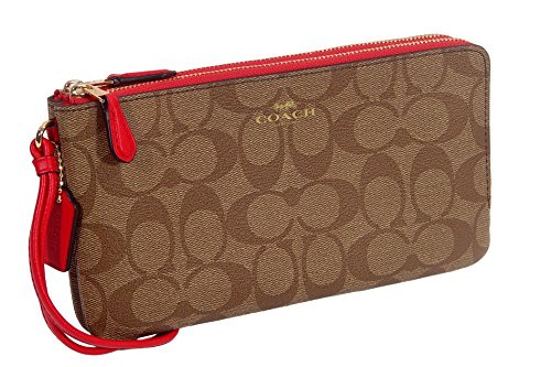 -. Title : Coach Signature Double Zip Wallet Cluth Bag - Khaki / Bright Pink