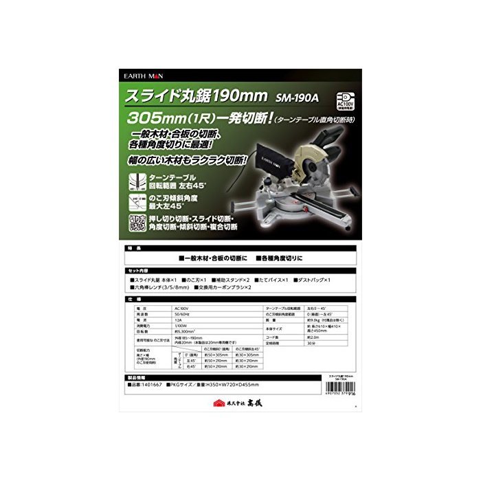 원본상품명:高儀 EARTH MAN スライド丸鋸 190mm SM-190A