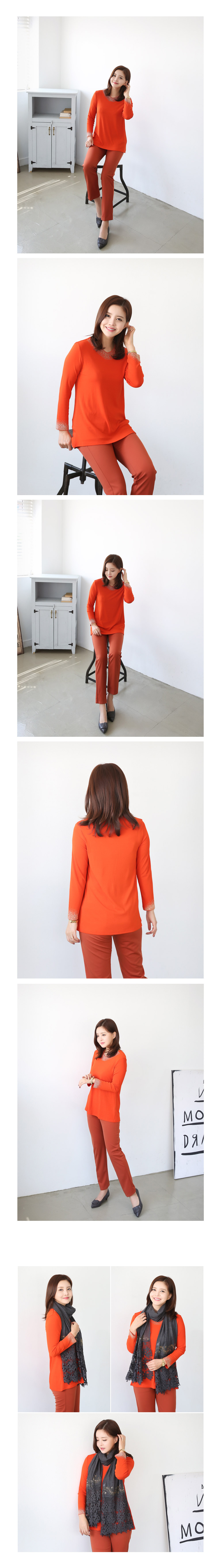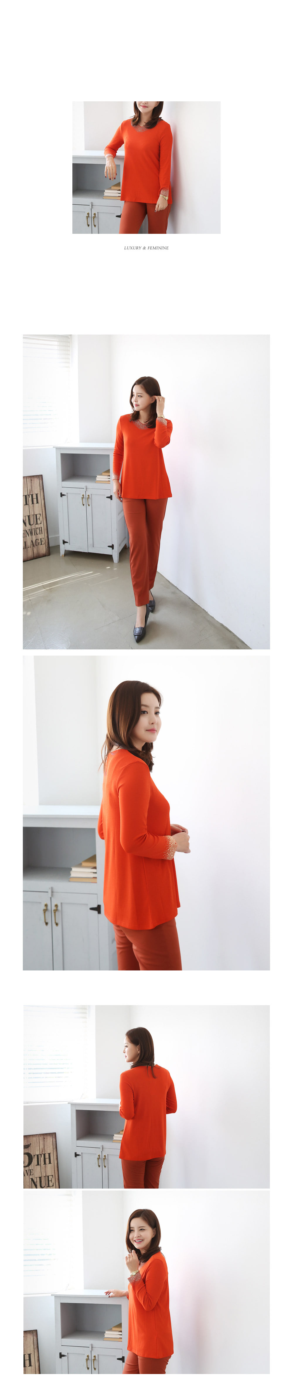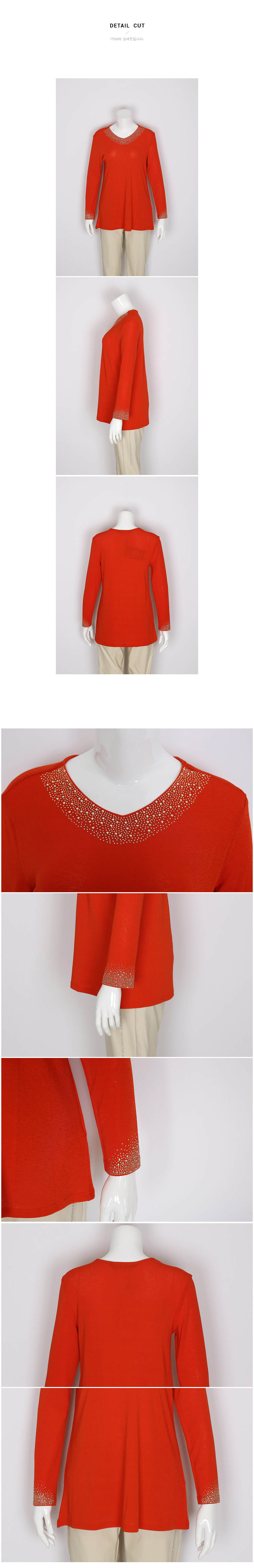 소매끝과 테크라인에는 비즈장식으로