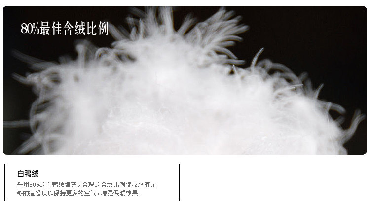 面料:100%聚酯纤维 撞料:79.2%锦纶 20.8%聚酯纤维 胆料:100%聚酯纤维 里料:100%聚酯纤维 填充物:白鸭绒 含绒量:80% 充绒量:XS#70g S#80g M#90g L#100g XL#110g XXL#120g