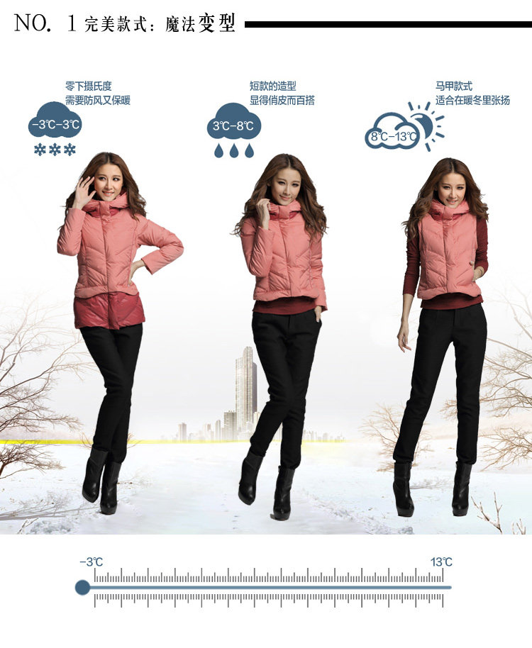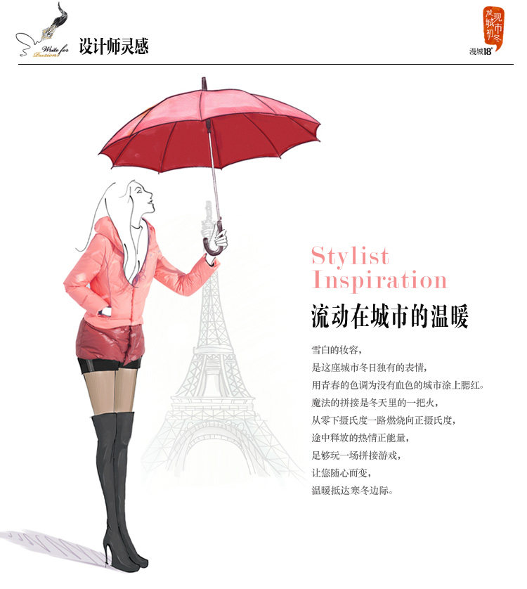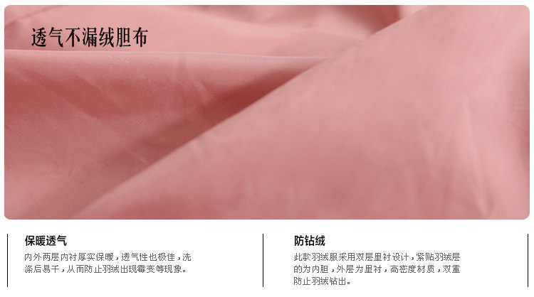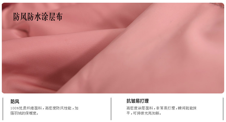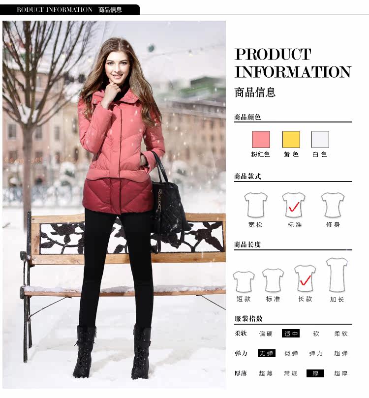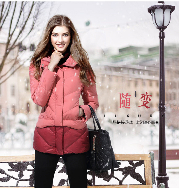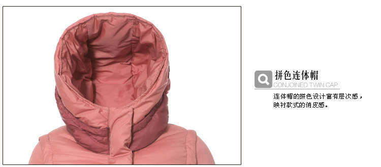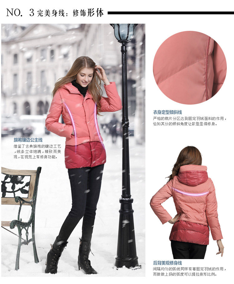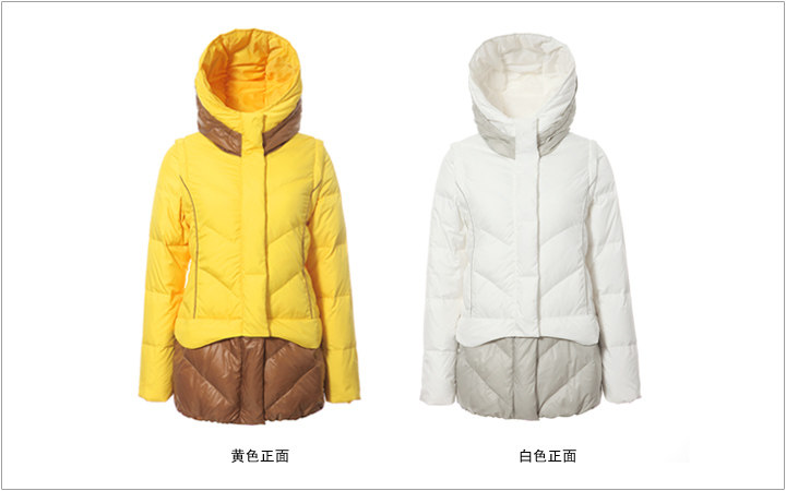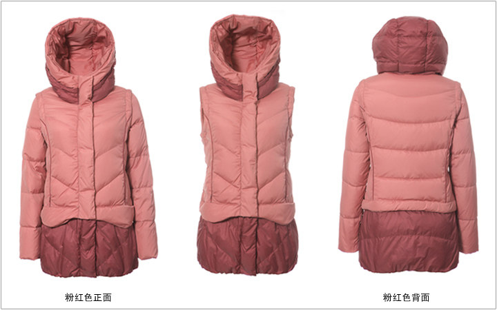 版型新颖考究,穿着合身舒适。收腰的版型便于身体活动,不会有厚重感。领口有拉链和暗扣可以闭合,保暖舒适,让您在冬天倍感温馨。拉开拉链可以露出精致的内搭,更显潇洒气质。帽子造型符合人体头部轮廓,不会有压迫感,内填充物饱满,里料和面料撞色,丰富细节。衣身外部轮廓为假两件套式,并且运用撞料设计,拉长身段,完善身材比例,更显高挑。简洁的直筒袖型,时尚大牌,不琐碎。公主线镶嵌皮条设计,细腻优雅,精致立体。整体衣身压线处理,可以让羽绒稳固,达到均匀保暖的效果。中间的下摆曲线设计顺畅圆滑,令女人柔美知性,高腰线设计,提升视觉效果。同色系的拼接搭配,十分的优雅。