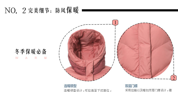 领部细节:领口有拉链和暗扣可以闭合,保暖舒适