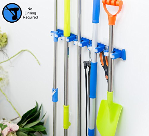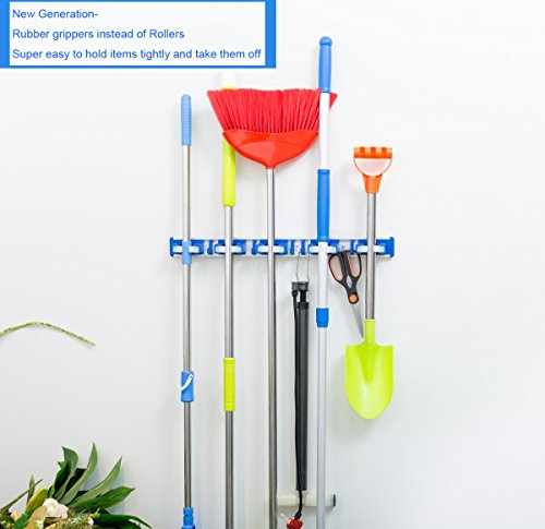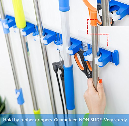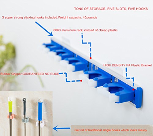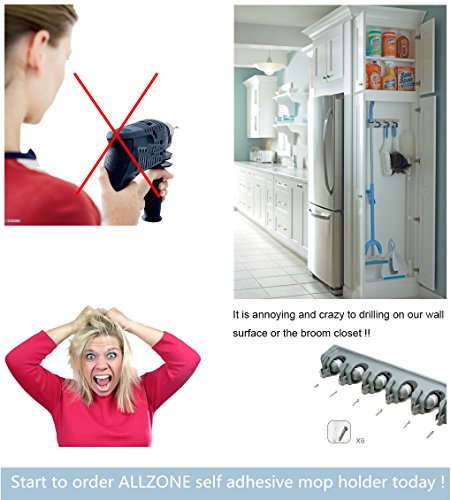 ALLZONE Self Adhesive Mop Broom Holder, Garden Garage Tool Organizer, 5 position 5 hooks, GUARANTEED NON SLIDE, Made by Aluminum