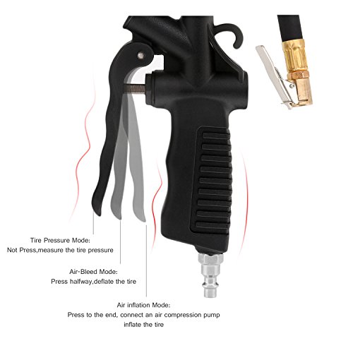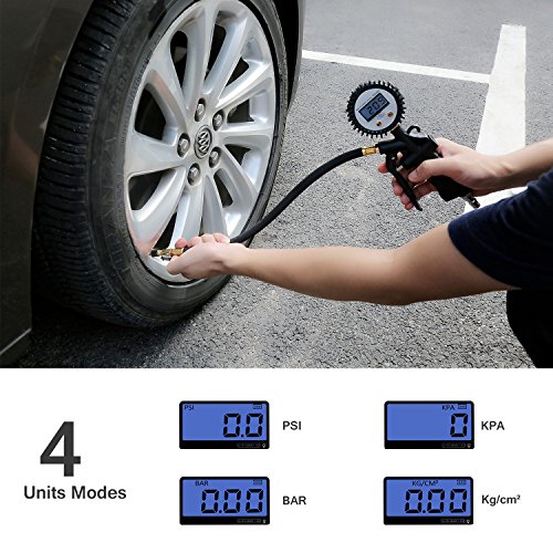 - ★3 MODES WITH 4 MEASUREMENT UNITS: Half press means deflate gas, full press means inflate, do not press the handle is measure the tire pressure, very easy to use it. This Tire inflator could be changed to 4 measurement units: Psi, Bar, kg/cm², Kpa, just press the change button to change the unit.