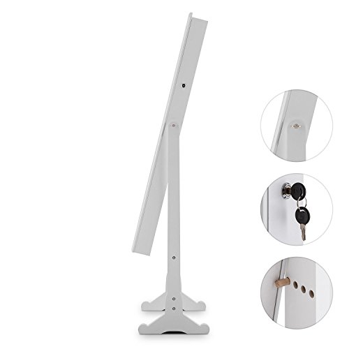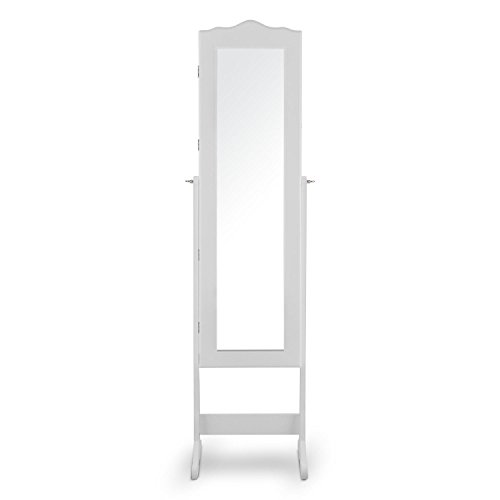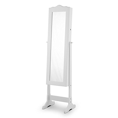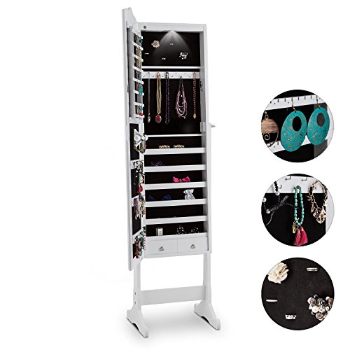 -. Feature : eleganter Schmuckschrank mit Spiegelfront zur Aufbewahrung modischer Accessoires | großer, horizontal schwenkbarer Ganzkörper-Spiegel mit einer Fläche von 23,5 x 107 cm | zahlreiche Ordnungsmöglichkeiten: Haken, Schubladen, Ablagen, Steckhalterungen / batteriebetriebene LED-Beleuchtung mit Türschaltung: wird beim Öffnen der Schranktür eingeschaltet | abschließbare Schranktür als Sicherung vor unerwünschtem Zugriff, z.B. durch Kinder / Ein-/Ausschalter der LED-Beleuchtung an der Oberseite im Schrankinneren | Material: Holz/MDF | Schloss an der rechten Außenseite oberes Drittel / Für alle, die von Schmuck und modischen Accessoires nicht genug bekommen können, leistet der Schmuckschrank Gracia von oneConcept wertvolle Dienste als elegante und übersichtliche Schatztruhe. Mit seinem weiß lackierten Holz und der großen Spiegeltür adelt der Schmuckspiegel jedes Schlafzimmer, Boudoir, Garderobe oder Jugendzimmer und ergänzt sie um einen attraktiven Blickfang. / Seine Schätze beherbergt der Gracia Schmuckschrank in seinem Inneren, das mit schwarzem Samt ausgekleidet ist: Hier finden sich zahlreiche Möglichkeiten zur Aufbewahrung von Ringen, Broschen, Piercings, Manschettenknöpfen, Tüchern, Brillen, Krawattennadeln, Haarreifen, Ketten und vielen weiteren Kleinodien - alles übersichtlich angeordnet und leicht zugänglich.