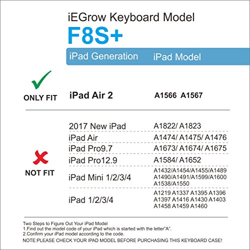 IMPORTANT! iEGrow iPad air 2 keyboard case ONLY compatible with the 2014 released iPad air 2 generation, we also have the same models for the iPad pro 9.7 and Air 1, search "B01ILUXY76" for the iPad pro 9.7, and "B010AV51M0" for the iPad Air 1.Please check the fit model table on the second picture.