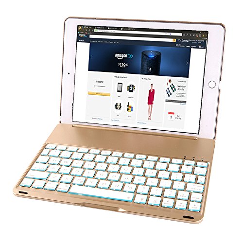 iPad Air 2 Keyboard Case, iEGrow F8S+ Slim Bluetooth Clamshell Keyboard Case with 7 Colors LED Backlit for iPad 6 (Gold)