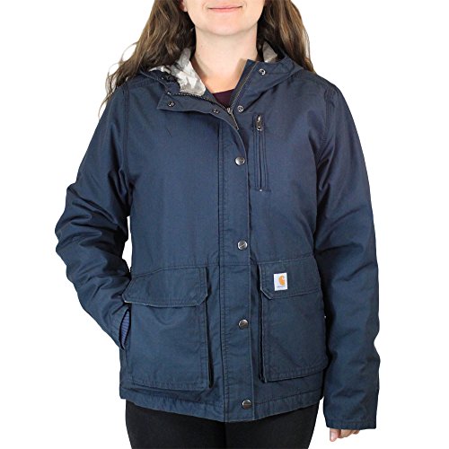 Studio : Carhartt Women's Collection Publisher : Carhartt Women's Collection Binding : Apparel Product Description Insulated, hooded, and has plenty of pockets. The perfect everyday jacket for fall. Made from 7-ounce, 100 percent cotton dobby and offers quilted, flannel lining in body and quilted nylon lining in sleeves, is insulated and has a zip front with snap placket with an attached three-piece hood with barrel lock adjusters, two lower-front pockets with flaps and snaps that double as hand warmer pockets with side entry, a zipper-secured chest map pocket and two interior pockets, rib knit cuffs and triple-stitched main seams for durability. It replaces 100667. 0