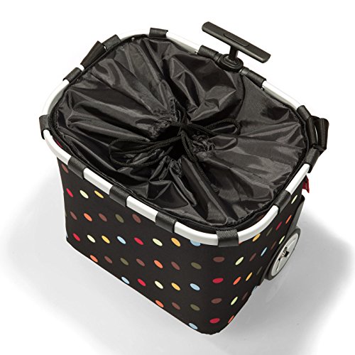 2-stage telescopic handle for height adjustment; adjustable, padded shoulder strap; large, smooth turning wheels; plastic feet for self-standing support; includes fixtures for attachment to grocery shopping carts