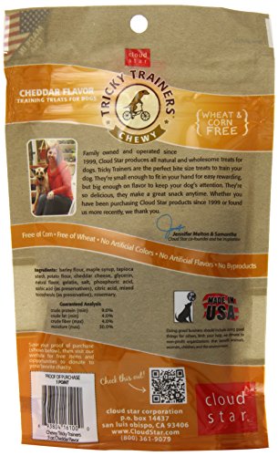 -. Binding : Misc. -. Brand : Cloud Star -. EAN : 0693804161000 -. Feature : Made with natural ingredients / Bite size, perfect for training / Low calorie treat / Made in the USA / Wheat, Corn and Soy free / Low calorie / Soft texture makes them ideal for small or older dogs / Made in USA -. Label : Cloud Star -. Manufacturer : Cloud Star -. Model : 16100 -. MPN : 16100 -. NumberOfItems : 6 -. PackageQuantity : 6 -. PartNumber : 16100 -. ProductGroup : Pet Products -. ProductTypeName : PET_SUPPLIES -. PublicationDate : 2010-08-13 -. Publisher : Cloud Star -. Size : N/A -. Studio : Cloud Star -. Title : Cloud Star Chewy Tricky Trainers - Cheddar, 5-Ounce Bags (Pack of 4) -. UPC : 693804161000