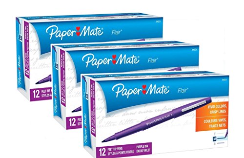 -. Binding : Office Product -. Feature : Point Guard prevents the tip from fraying even after repeated use / Quick-drying; water-based ink resists smearing / Specially designed ink will not bleed through paper / Medium point produces bold and expressive lines / Includes: 36 Purple felt tip pens -. Label : Papermate -. Manufacturer : Papermate -. MPN : 845-01 -. PackageQuantity : 1 -. PartNumber : 845-01 -. ProductGroup : Office Product -. ProductTypeName : WRITING_INSTRUMENT -. Publisher : Papermate -. Studio : Papermate -. Title : Paper Mate 8450152 Flair Porous Felt Tip Pens, Medium Point, Purple, 36-Pack