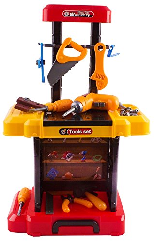 REALISTIC, KID-FRIENDLY DESIGN: Portable tool play set - workbench can be turned into a suitcase for easy portability and storage! Plastic Tools Look & Function Like Actual Construction Tools. NEAT COMPACT WORKBENCH - Completely Self Contained; Back Board With Hooks & Bottom Bucket Shelf Hold & Organize Tools. ASSORTED PLAY TOOLS - A variety of tools including a hammer, wrench, screwdrivers, drill, screws, and much more! Requires 2x AA batteries for Drill (not included). FULLY EQUIPPED WORKSHOP BENCH - with all the necessary tools to help fix any problem / Great for pretend play and helping mommy and daddy. MADE OF DURABLE SAFE PLASTIC - All tools are made of durable plastic making them safe for your kids to play with.Feature
