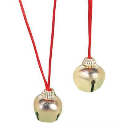 Necklace has 1" goldtone metal jingle bell is on a 28" satin cord