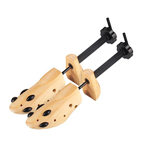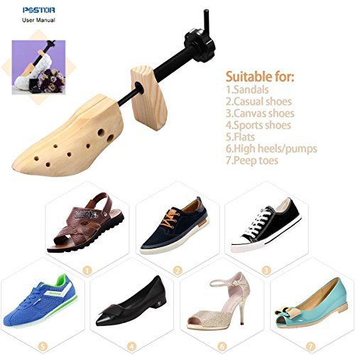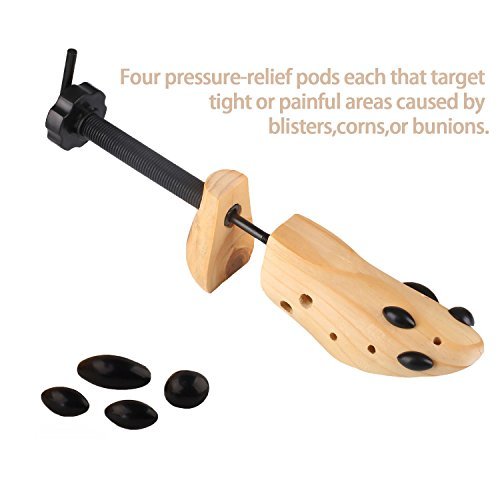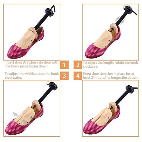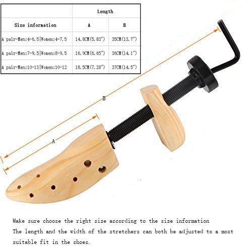 Stop Wearing Painful Shoes! It has happened to us all: we get those brand new shoes on our feet only to find that they are unbearable to wear. Or we have that pair of shoes that we love but they have never seemed to fit correctly. Whether it is the tightness of the shoe or pain caused by a foot ailment such as a corn or bunion, you do not need to suffer any longer! You can now correctly stretch your favorite shoes for a more comfortable fit with this pair of New 3-way wood shoe stretchers. The wooden components of this stretcher are made of highly polished pine wood designed to stretch the width of low heel shoes and other tight-fitting shoes to provide relief to feet suffering from bunions, corns, hammertoes or even wide feet. No More Breaking In Shoes Yourself. You can also use it to stretch new shoes, reducing the painful break-in period. This handy device enables you to stretch any pair of shoes to accommodate the exact size of your feet. Targeted Relief Also included are 4 removable pressure relief plugs, allowing you to stretch very small areas of your shoes, letting you zero in on painful pressure points. Steps ★At first, insert the removable pressure relief plugs in the appropriate holes where relief is needed. Then insert stretcher in shoe. Ⅰ- LENGTH STRETCH : Turn the round plastic handle in clockwise direction until you begin to see surface pressure showing on shoe. Ⅱ- WIDTH STRETCH : Turn the metal crank handle in clockwise direction until you begin to see surface pressure showing on shoe. Ⅲ-WAIT FOR THE BEST RESULTS: Leave shoe stretcher in place for at least 24 hours.
