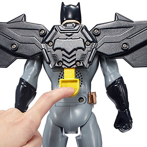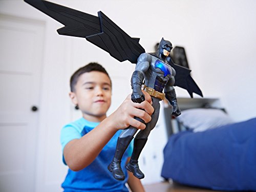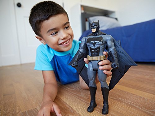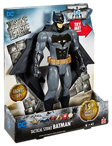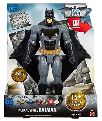 -. Feature : 12" scale deluxe Batman action figure from the new Justice League movie / Wears an updated tactical armor Batsuit / Dramatic lights and sounds enable realistic battle / Pull-tab on figure's back to pop wings out, light chest up and hear signature phrases / 5 points of articulation for epic action posing