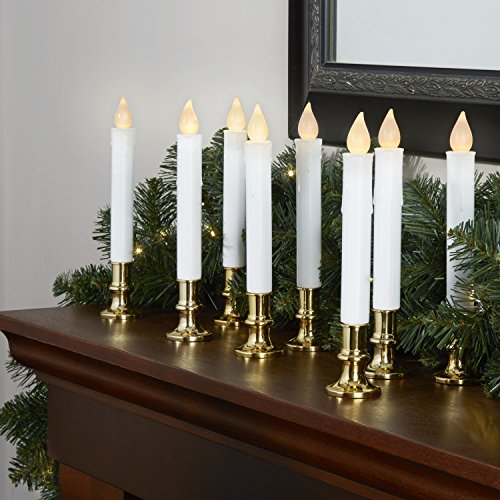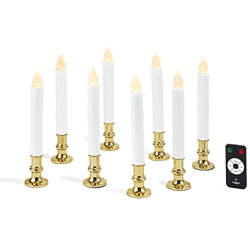 Flameless White LED Taper Candles with Gold Removable Candle Holders, Remote & Batteries Included - Set of 8