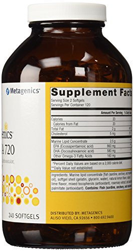 -. Binding : Health and Beauty -. Brand : Metagenics -. EAN : 0791090049917 -. Feature : Omega-3 fatty acids are considered essential fatty acids / omega-3 fatty acids play a crucial role in brain function / They have also become popular because they may reduce the risk of heart disease / Omega-3 fatty acids are highly concentrated in the brain and appear to be important for cognitive (brain memory and performance) and behavioral function -. IsAdultProduct : 0 -. Label : Metagenics -. LegalDisclaimer : This product has not been evaluated by the Food and Drug Administration. It is not intended to diagnose, treat, cure or prevent any disease. -. Manufacturer : Metagenics -. MPN : EPAL7240 -. PackageQuantity : 1 -. PartNumber : EPAL7240 -. ProductGroup : Health and Beauty -. ProductTypeName : HEALTH_PERSONAL_CARE -. Publisher : Metagenics -. Studio : Metagenics -. Title : Metagenics EPA-DHA 720 Lemon 240 softgels -. UPC : 791090049917