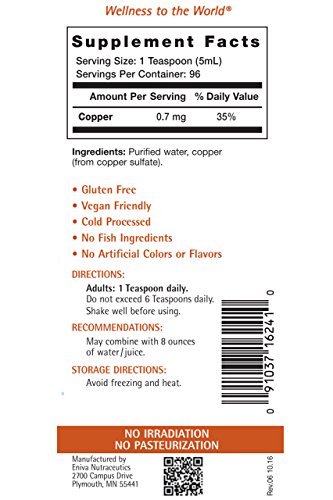 -. Feature : Eniva Minerals for Life Copper Liquid Concentrate is a dietary supplement of the Cell-Ready essential trace mineral COPPER in a proP.R.Ietary nutrient delivery system. / Copper Supports: Red Blood Cell Health Growth and Development Healthy Immune System Healthy Skin, Hair and Nails Healthy Joints, Cartilage and Tendons. / Straight to you from our corporate manufacturing headquarters, Eniva Copper Ionic Mineral Liquid Concentrate is a dietary supplement of the Cell-Ready mineral copper in a proP.R.Ietary nutrient delivery system. It is a specialized health liquid designed to naturally support the normal development, structure, function and health of joints, cartilage and tendons.* / It is a cofactor in several important enzyme systems in the body, which can help support a healthy immune system, red blood cell health, as well as overall normal growth and development*. Copper can aid in supporting normally healthy skin, hair and nails.* / Through the use of Eniva's purified OHM water in combination with proP.R.Ietary processes, Eniva Ionic Copper represents a safe method to also support the body's natural processes that maintain normal cellular replication.* Its advanced liquid nutrient delivery system provides fast, easy absorption.*