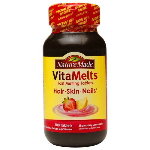 -. Binding : Health and Beauty -. EAN : 0031604100469 -. Feature : Fast Melting Tablets / May help support healthy hair, skin and nails for those deficient in biotin* / Vitamin C helps support collagen production* -. Label : Nature Made -. Manufacturer : Nature Made -. PackageQuantity : 5 -. ProductGroup : Health and Beauty -. ProductTypeName : HEALTH_PERSONAL_CARE -. Publisher : Nature Made -. Studio : Nature Made -. Title : Nature Made VitaMelts Hair, Skin & Nails, Tablets, Strawberry Lemonade 100 ea Pack of 5 -. UPC : 031604100469