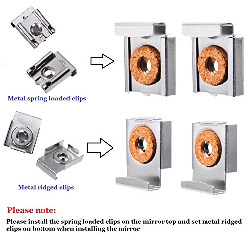 - EASY TO INSTALL - Install a pair of metal ridged clips evenly on the bottom, and place the mirror on them to mark out the spring loaded clips, remove the mirror, and drill and secure the top metal spring clip