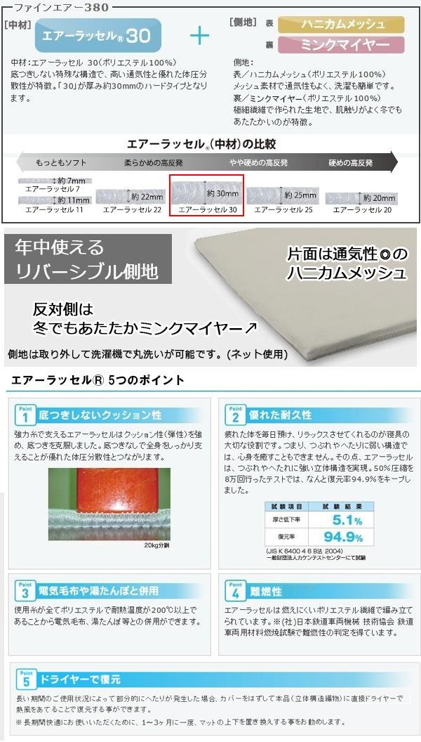 | 中材で使用されている「エアーラッセル」は、底つきしない特殊な構造で、高い通気性と優れた体圧分散性が特徴です。側地の表はメッシュ素材で通気性もよく、洗濯も簡単です。裏はミンクマイヤーという生地で、冬でも暖かく、オールシーズン快適に過ごすことが出来ます。 |