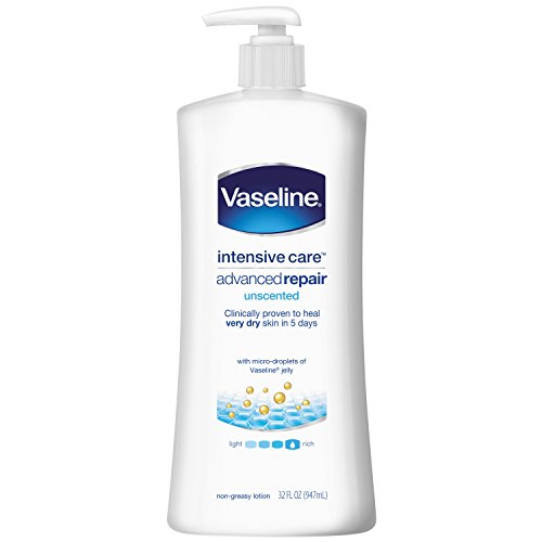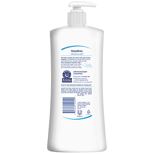 Vaseline Intensive Care Advanced Repair Unscented Lotion combines healing micro-droplets of Vaseline Jelly and moisturizing glycerin. The result is a body lotion that deeply moisturizes to heal very dry skin in only 5 days.Suitable for Extra Dry SkinThe Vaseline Advanced Repair Lotion isn’t just your average moisturizing lotion. The formula delivers prescription-strength moisturization to restore soft, healthy looking skin. Advanced Repair Lotion is a dry skin lotion that can moisturize stubborn dry patches on your skin and help you achieve soft skin. Lotion for Dry SkinAdvanced Repair body moisturizer helps to relieve dry skin from the first application. The micro-droplets of Vaseline Jelly penetrate deep down to form a protective layer on your skin and lock in moisture. This sealing barrier speeds up the skin’s natural barrier recovery. Advanced Repair dry skin moisturizer also contains glycerin and dimethicone, which draw moisture to the skin to rehydrate very dry skin. With this combination of deeply moisturizing ingredients, Vaseline Advanced Repair works as an effective body moisturizer that offers fast relief for dry, stressed skin, with the assurance that it’s suitable for sensitive skin.National Eczema Association (NEA) Seal of Acceptance With its seal of approval from the NEA, Vaseline Intensive Care Advanced Repair Unscented can be used to moisturize eczema-prone dry skin and as a moisturizer for dry skin.Feature