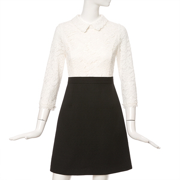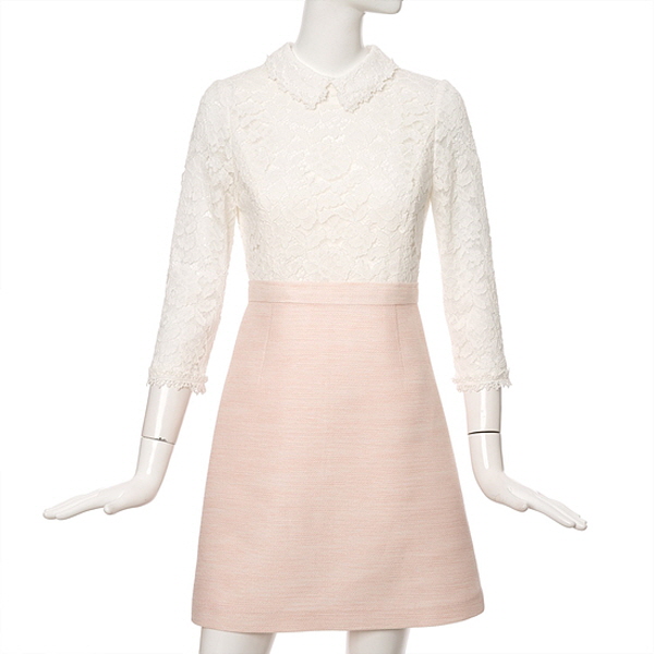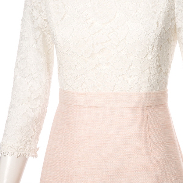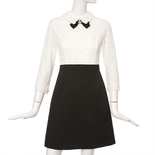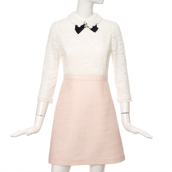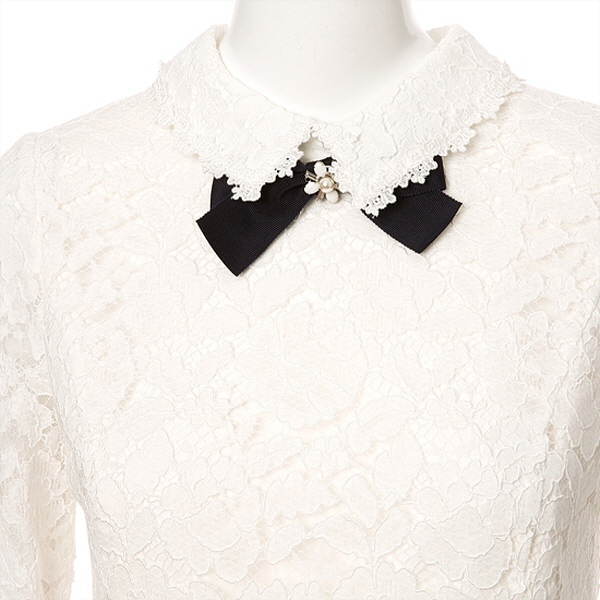 리본 브로치가 잘 어울리는 자수레이스카라넥으로 상의전체부분이 레이스소재로 되어있어서 스커트 배색이 더욱 돋보이는 스타일입니다.