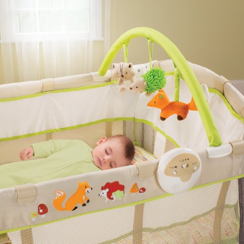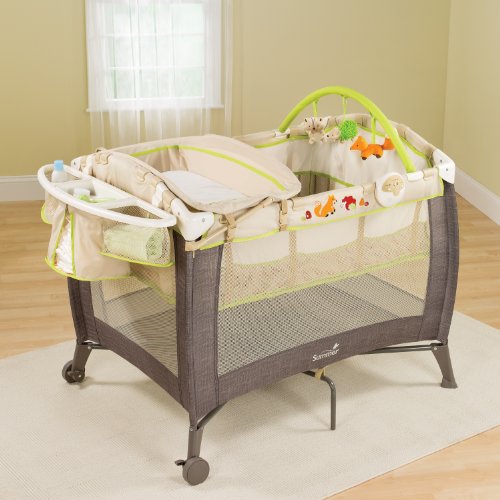 - Feature : Grows with baby from birth to 30 pounds: newborn bassinet, infant changer, full-size playard / Parent assist tray with plenty of storage for diapers, wipes, and other diaper changing essentials / Removable music module features soothing nature and womb sounds, soft melodies and calming vibrations / Removable toybar with three plush toys to engage baby / Portable design to easily move the playard from room to room, locking wheels provide security when in use