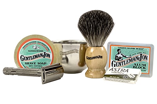 Gentleman Jon Complete Wet Shave Kit | Includes 6 Items: Safety Razor, Badger Hair Brush, Alum Block, Shave Soap, Stainless Steel Bowl and Astra Razor Blades