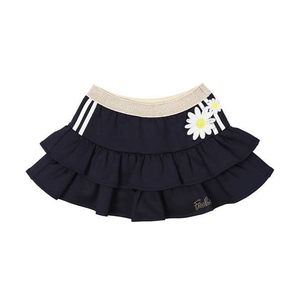 상품설명 네이비 데이지 캉캉 스커트입니다. 속바지 부착 제품으로 편안하게 착용할수 있구요. 허리는 골드밴드 처리되어 있습니다. 옆선에 들어간 화이트 두줄 테이프와 데이지 자수로 포인트를 더해 준 발랄한 스타일입니다.안에 속반바지가 붙여있는 스타일입니다