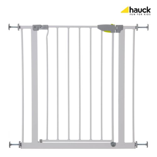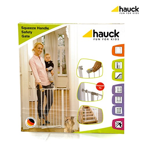 Parents will love the Hauck Squeeze Handle Safety Gate for it's ease of use and charming appeal. A firm adjustable pressure-mounted system allows parents the ease of removing the gate without damage to door frames or walls. An adult friendly squeeze handle allows quick access through the gate and locks with a firm latch that an infant will not be able to operate. It works well for large openings as it comes with an extension kit that will accommodate door frames and hallways (from 29.5 inches to 37.5 inches)