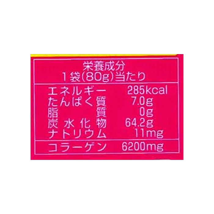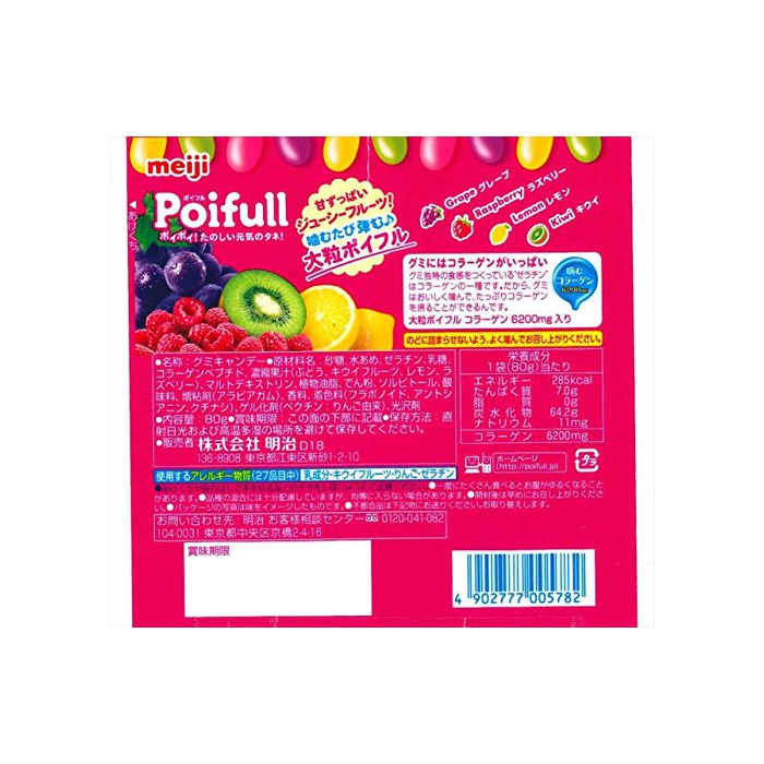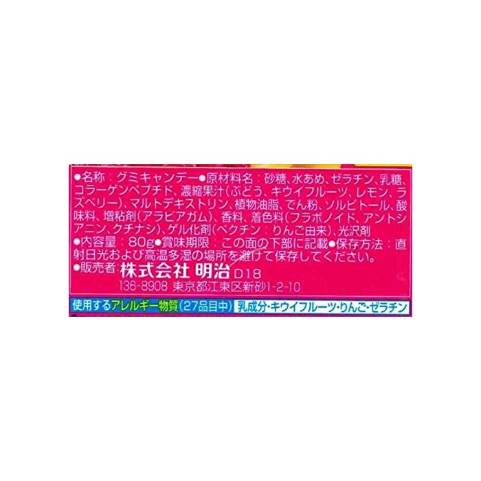 원재료:설탕,물엿,젤라틴,유당,콜라겐 펩티드,농축 과즙(# 어떻게(아무리),키위 후루츠,레몬,《라즈베리》)고, 말《도데키스토린》,식물성 기름지,나오지 않겠 분,솔《비토루》,신맛료,증점제(아라비아 껌)고, 향료,착색료(후라보노이드,앤《도시아닌》,치자나무)고, 겔화 제(백 친:사과 유래)고, 광택 제